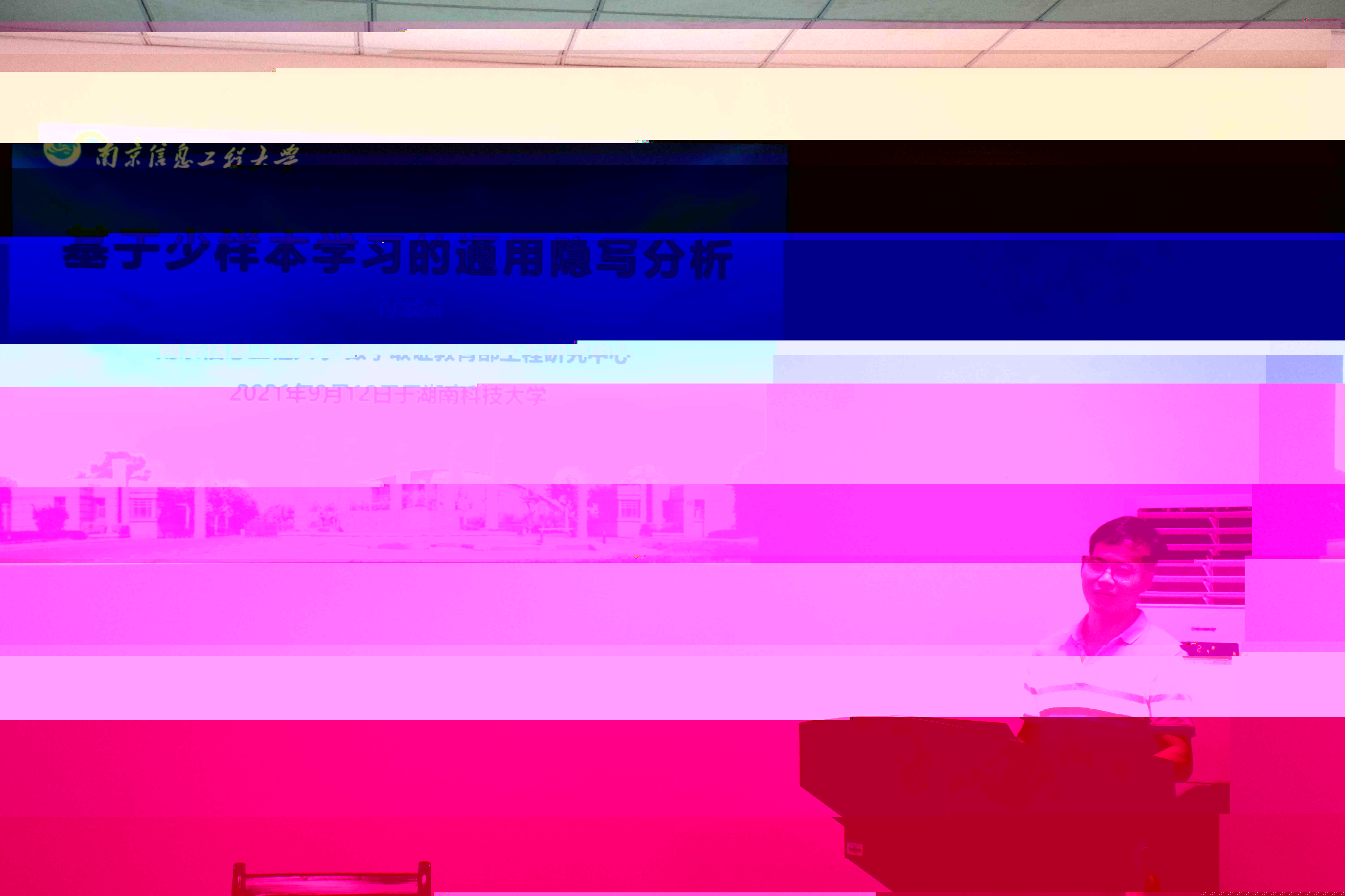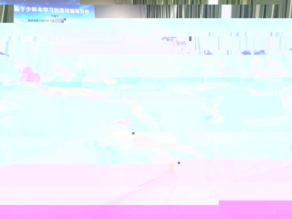 會議伊始,付章傑教授作了題為《少樣本隐寫分析》的學術報告。他首先介紹了深度隐寫分析的背景、研究現狀與未來發展。然後點明了深度學習在圖像隐寫分析任務中表現出的優越性能。進一步提出:在實際的通用隐寫分析任務中,隐寫算法的大量載密圖像數據集是難以得到的,如何在極少隐寫圖像樣本的情況下訓練通用隐寫分析模型依然是一個極大挑戰。對此,受少樣本學習領域研究成果的啟發,他們團隊提出基于少樣本學習的通用隐寫分析方法。