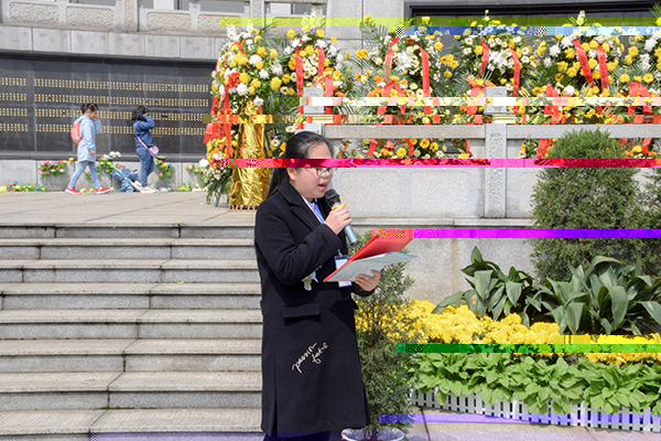 活動初始,我院學子來到烈士墓前,他們向革命先烈們敬獻鮮花,并莊重鞠躬,表達着他們對先烈們的哀悼與敬仰之情。在參觀完烈士墓後,同學們懷着沉重的心情來到革命烈士紀念碑下,烈士碑四周松柏環繞,氣氛莊嚴。首先,由全體人員共同奏唱國歌。曲畢,集體為革命先烈們默哀一分鐘。全程靜穆莊重,同學們心潮起伏,思緒萬千。緊接着,我院學子齊誦了毛澤東詩篇《七律·長征》、《清平樂·六盤山》,将無限的敬意化成锵金鳴玉的朗誦,回蕩在紀念碑廣場上。