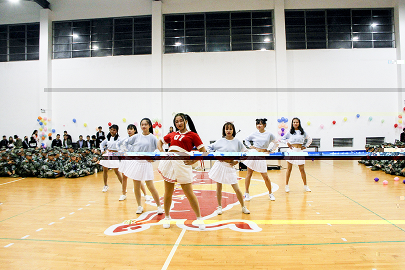 短暫的視頻帶新生們回顧了這十二天的軍訓生活後,我院軍訓合唱團帶來了節目《強軍戰歌》、《歌唱祖國》,雄壯的歌聲在會場回蕩。歌聲還未散去,由拉拉隊帶來的舞蹈賺足了眼球。節目一個個上演,現場氣氛十分活躍。最後各班助班帶來的神秘節目,雙人走秀和合唱軍訓版成都徹底引爆全場,同學們的歡呼聲不絕于耳。