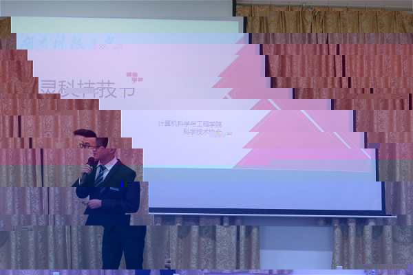 院科協主席袁博用PPT介紹本屆科技節相關賽事及活動,包括軟件應用與開發類競賽、代碼情書大賽及義務維修、“微科”講壇、創業孵化基地入駐項目征集等活動。