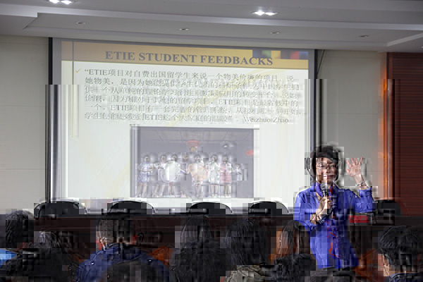 會議伊始,周棟向同學們對周謙教授進行了詳細的介紹,并代表學院全體師生對周謙教授的到來表示熱烈歡迎。首先,周謙教授向同學們說明了ETIE項目内容及選拔條件。項目包含:3+1本碩連讀項目、4+0.5+1的研究生項目等,各項目對學生的要求不一,能夠給予學生更多機會。緊接着,她展示出的ETIE outcomes、why ETIE、ETIE student feedbacks三個模塊更加深入全面地帶領了同學們了解項目内容及學校環境。在接下來的互動交流環節,周謙教授對在座學生提出的問題一一耐心解答。随後,劉文娟具體講解了報名要求及注意事項,鼓勵同學積極參加。最後,周棟緻結束語,本次ETIE學生交流項目事宜宣講會圓滿結束。
