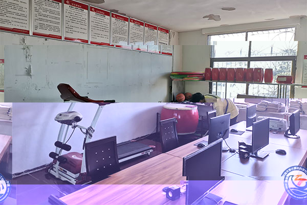 農家書屋裡,志願者正在做清掃工作,書屋配備了電腦和健身器材