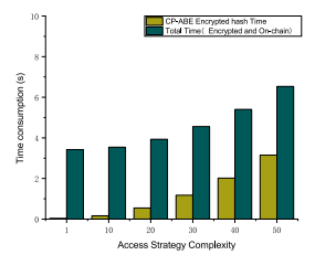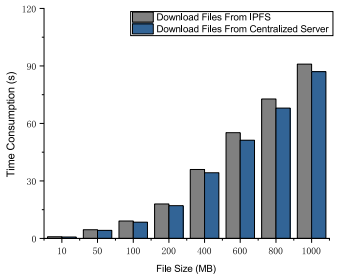 當前區塊鍊個人數據隐私保護方案存在着顯式存儲、用戶細粒度訪問控制困難、數據缺乏透明度與可審計性等問題,面對這些問題與挑戰,梁偉教授等人提出了一種基于聯盟區塊鍊的個人數據隐私保護方案,該方案首次使用改進的Paillier同态加密機制加密存儲原始數據。聯盟區塊鍊結合分布式私有集群存儲加密數據,通過鍊下存儲和鍊上傳輸的協同,提高數據傳輸效率,保障用戶隐私和安全。同時提出基于密文策略屬性加密來實現細粒度的訪問控制。所提出的隐私保護方案分别加速了現有解密運行時間與加密運行時間25%和48%,文件加密上傳時間與下載時間如下圖所示。
