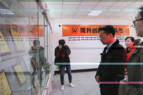 王利一行來到我院微科創新創業基地,先後參觀了我院科學技術協會辦公室、微科逐夢工作室及“唯實”、“惟新”、“至誠”、“緻志”、“立德”五個創客工作室,同時詳細地詢問了我院學生創新創業團隊和團隊考核辦法。在此期間,王利與我院優秀學生王骕進行了有關創業項目、運營公司所在地、公司規模和團隊的交流,充分肯定了王骕的創業成果以及專業能力。之後,王利一行來到我院學生第二課堂風采展示長廊,浏覽了我院學生豐富多彩的課餘生活剪影。最後,王利一行走訪了我院朝陽黨建辦公室、潤夢空間心理成長輔導室等特色項目辦公室。至此,本次視察調研工作圓滿結束。